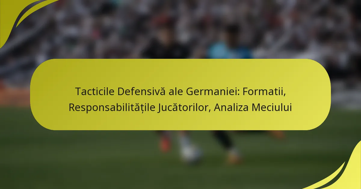 Tactica defensivă a Germaniei este caracterizată printr-o varietate de formații, cum ar fi 4-2-3-1 și 3-5-2, fiecare adaptată pentru a îmbunătăți responsabilitățile jucătorilor și a se adapta la adversari. Strategia echipei subliniază roluri clare, comunicare eficientă și o abordare structurată a presingului, asigurând o apărare coezivă. Prin analiza detaliată a meciurilor, antrenorii rafinează aceste tactici evaluând performanța jucătorilor și făcând ajustările necesare pentru meciurile viitoare.